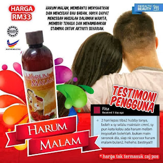 Harum Malam ni dapat menyelesaikan masalah bau badan dan keintiman wanita. Dapat hilangkan keputihan, vagina terasa kering sentiasa, no lembap2.. If vagina korang lembap, confirm la kan bakteria senang membiak n menimbulkan kegatalan pada kawasan tu. Say No !